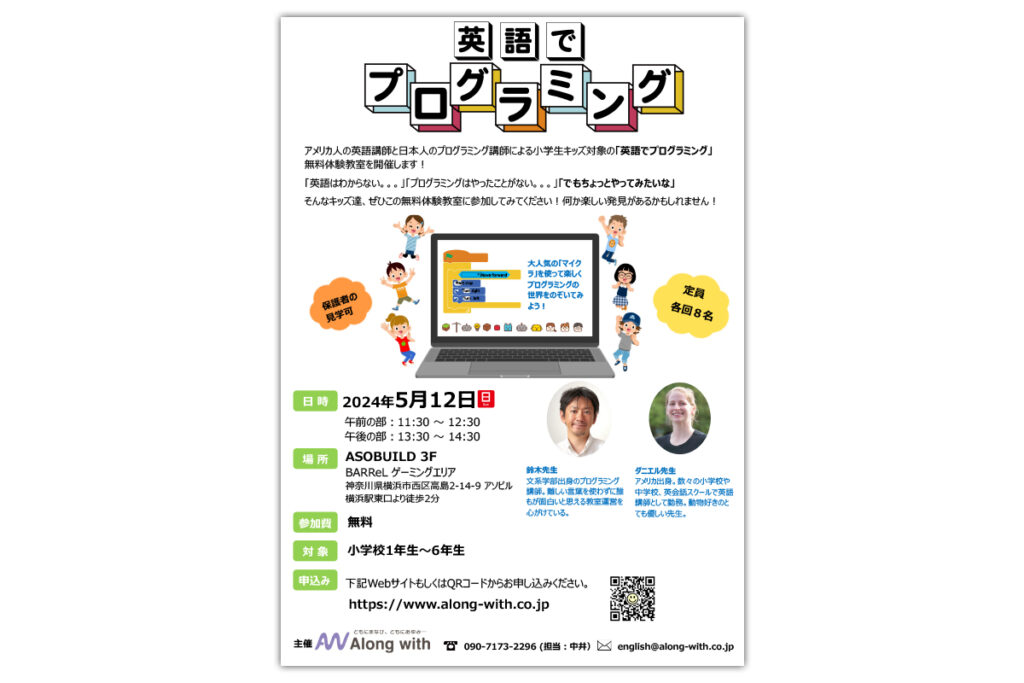 アメリカ人の英語講師と、日本人のプログラミング講師による、小学生キッズ対象の『英語でプログラミング』無料体験教室を開催します!